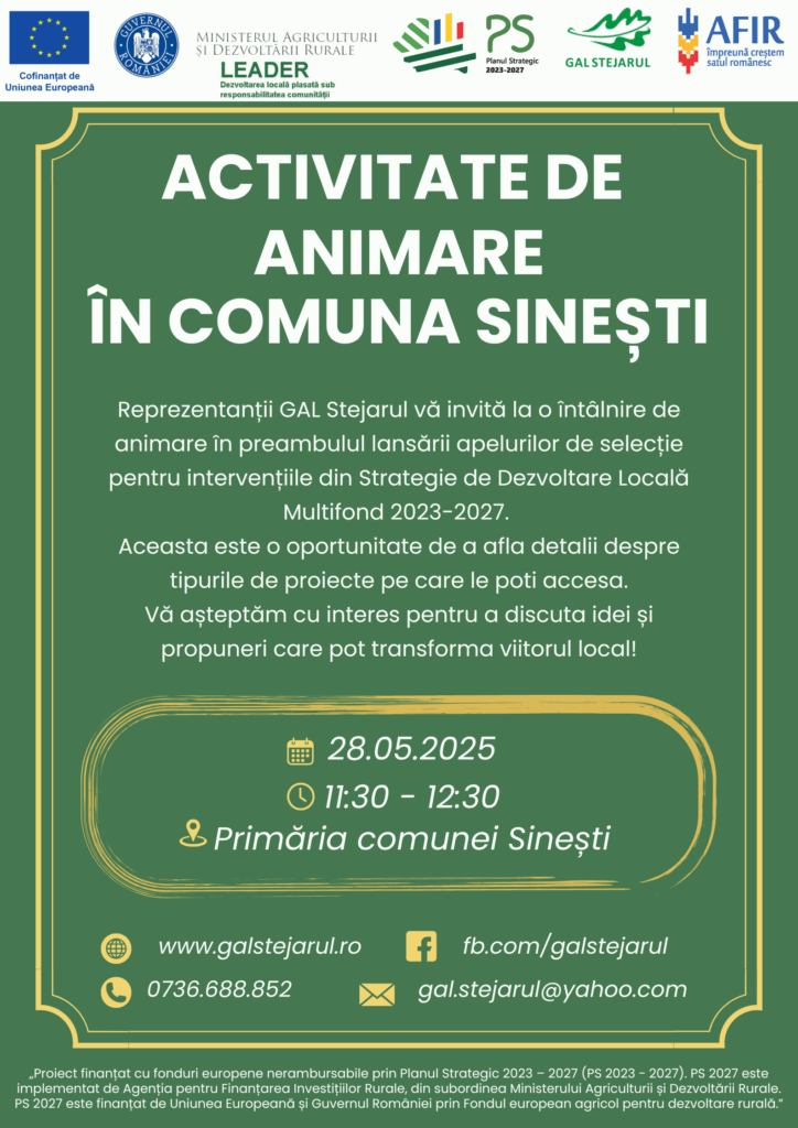 Reprezentanții GAL Stejarul vă invită la o întâlnire în teritoriu, unde vom oferi informații despre noua Strategie de Dezvoltare Locală Multifond 2023-2027 a Asociației GAL STEJARUL.