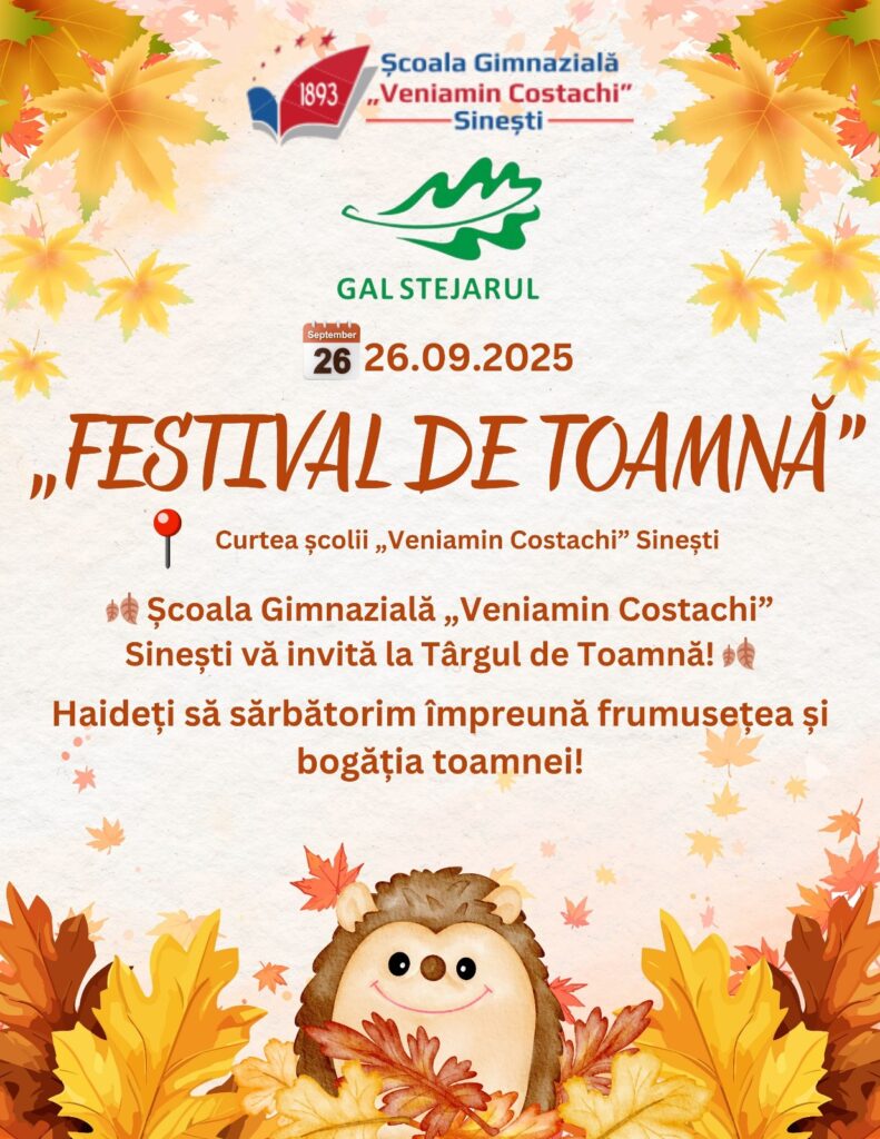 Asociația GAL Stejarul vă invită la Festivalul de Toamnă, organizat în data de 26.09.2025 în Curtea școlii „Veniamin Costachi” Sinești, în parteneriat cu Școala Gimnazială „Veniamin Costachi” SINEȘTI.