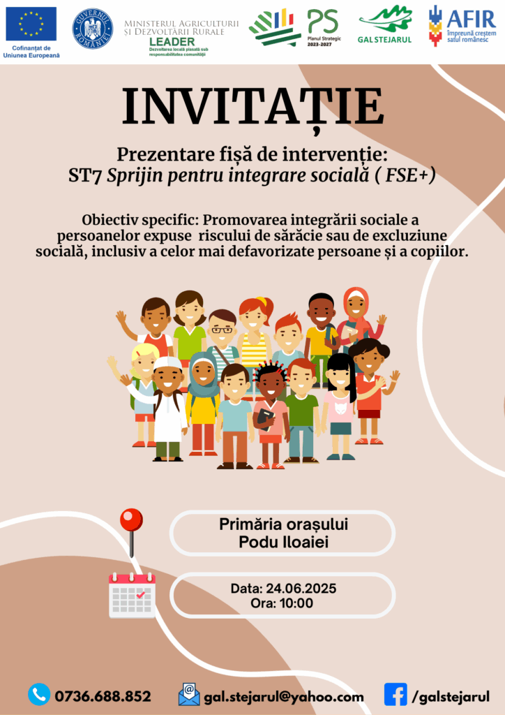 Asociația GAL STEJARUL organizează o întâlnire informativă privind oportunitățile de finanțare oferite de Intervenția APC7 „Sprijin pentru comunitate”, depusă în cadrul FSE+. Discuțiile vor viza tipurile de activități eligibile și direcțiile prioritare de intervenție pentru sprijinirea copiilor și familiilor defavorizate din teritoriu.