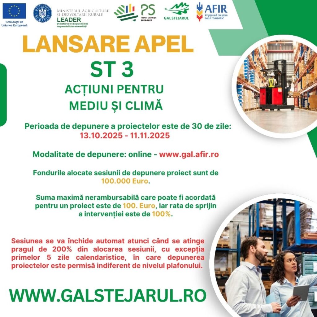 Lansare apel depunere proiecte pentru intervenția ST3 Acțiuni pentru mediu și climă (804/000/1/3/2025)