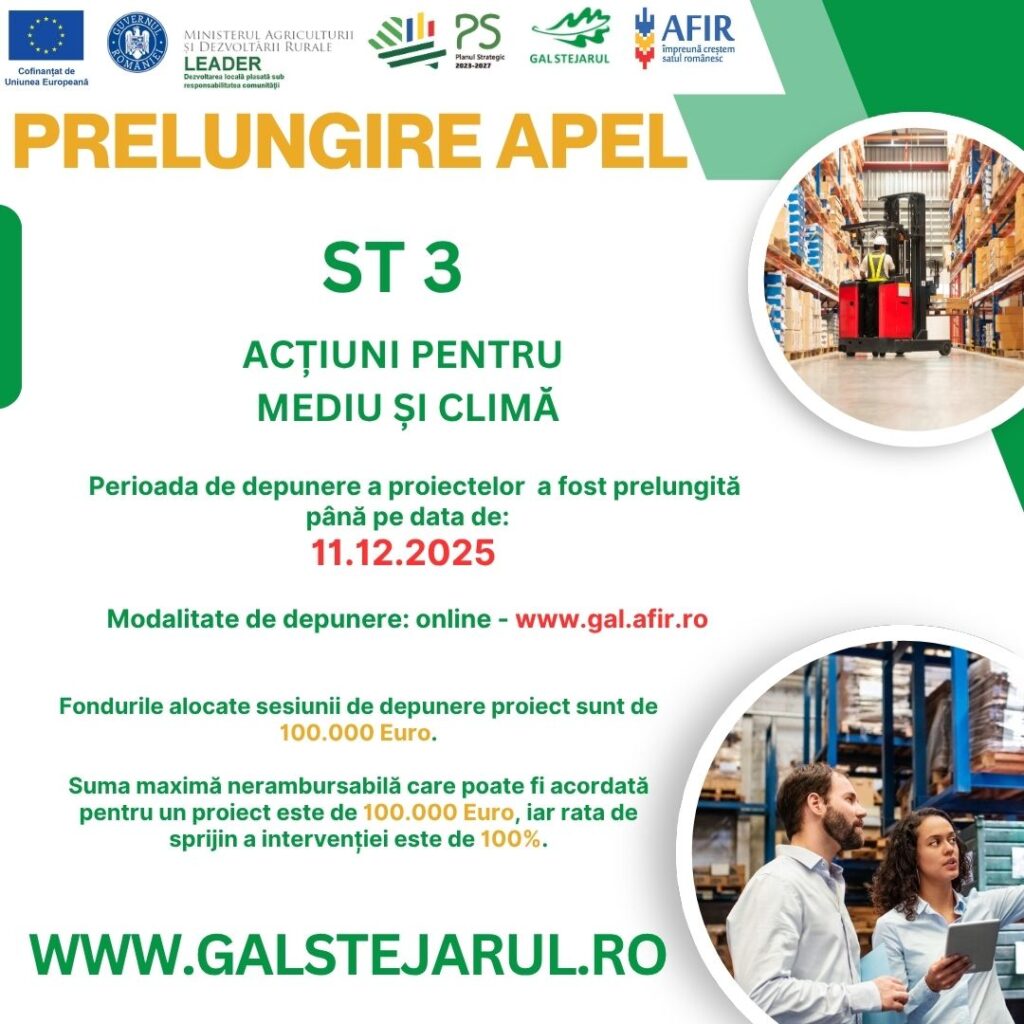 Asociația GAL Stejarul anunță prelungirea apelului de depunere proiecte pentru intervenția ST3 Acțiuni pentru mediu și climă (804/000/1/3/2025) până la data de 11.12.2025